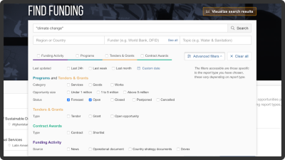The Devex funding platform captures the earliest news on future funding, active tenders, grants, right through to contract award data from all official funders. We use machine learning algorithms to extract and classify data, making it accessible and interactive at scale for our members.